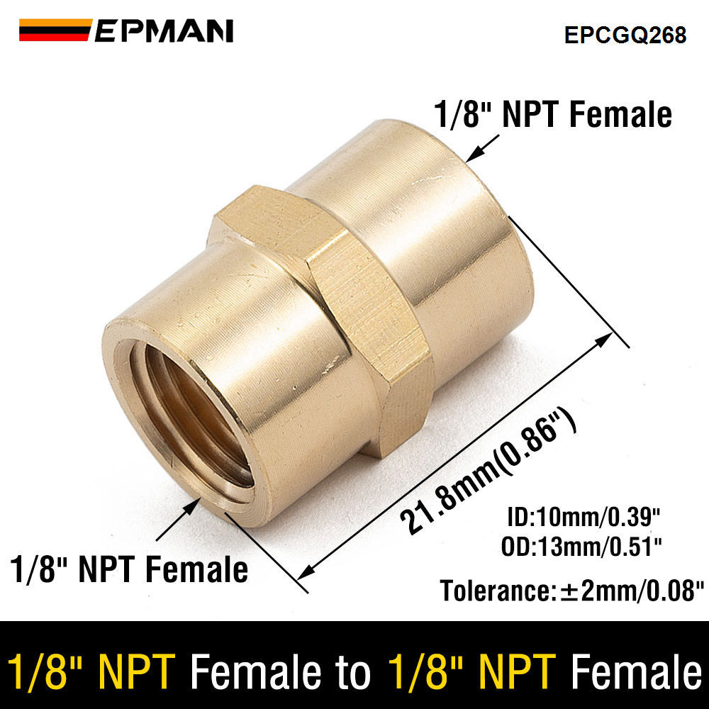 EPCGQ268 | Item Name: Female NPT to Female NPT Adapter Size: 1/8" NPT Female to 1/8" NPT Female thread Material: CNC Brass Package Included: 1x 1/8" NPT Female Brass Coupler (same as the picture) |